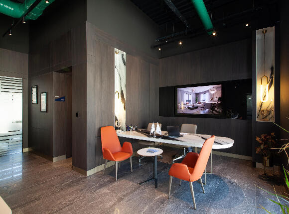 Aura İnşaat Satış Ofisi’nde logonun yer aldığı porselen plaka, siyah-beyazın yalın kontrastını LED detaylarla desteklerken, akışkan formu nazikçe saran resepsiyon bankosu mekanda heykelsi bir etki yaratıyor. Tavanın altında asılı akustik paneller, ahşabın doğal tonlarıyla tezat oluşturarak hafifçe süzülüyormuş hissi veriyor. Bu sayede yüksek tavanın yarattığı soğukluğu dengelerken samimi bir atmosfer yaratıyor. Ofisin toplantı odasında duvara monte yüksek çözünürlüklü panolar, projeyi soyut bir tuvale dönüştürüp izleyenin zihninde mimari bir rüya etkisi uyandırıyor.