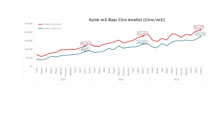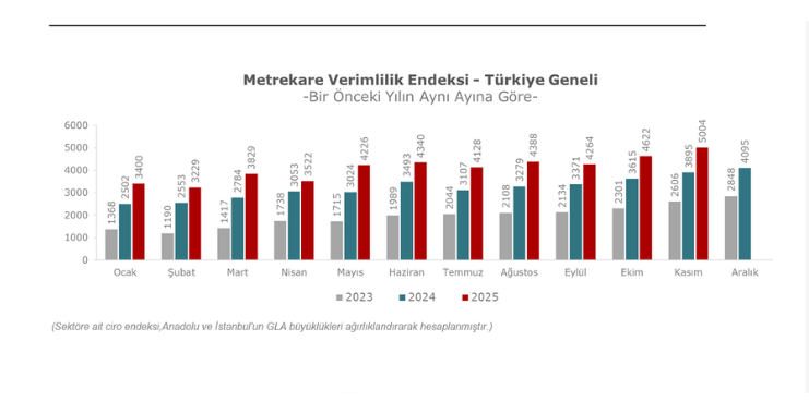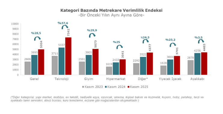 “AVM ciro endeksi kasım ayında nominal olarak yüzde 28,5 büyüdü. TÜFE ile arındırıldığında reel olarak yüzde 2’lik bir daralma söz konusu. Teknoloji kategorisi yüzde 37,6 büyüme ile reel olarak pozitif ayrışan tek alan. Buna karşın ayakkabı segmenti açık ara en zayıf performansı sergiliyor.”