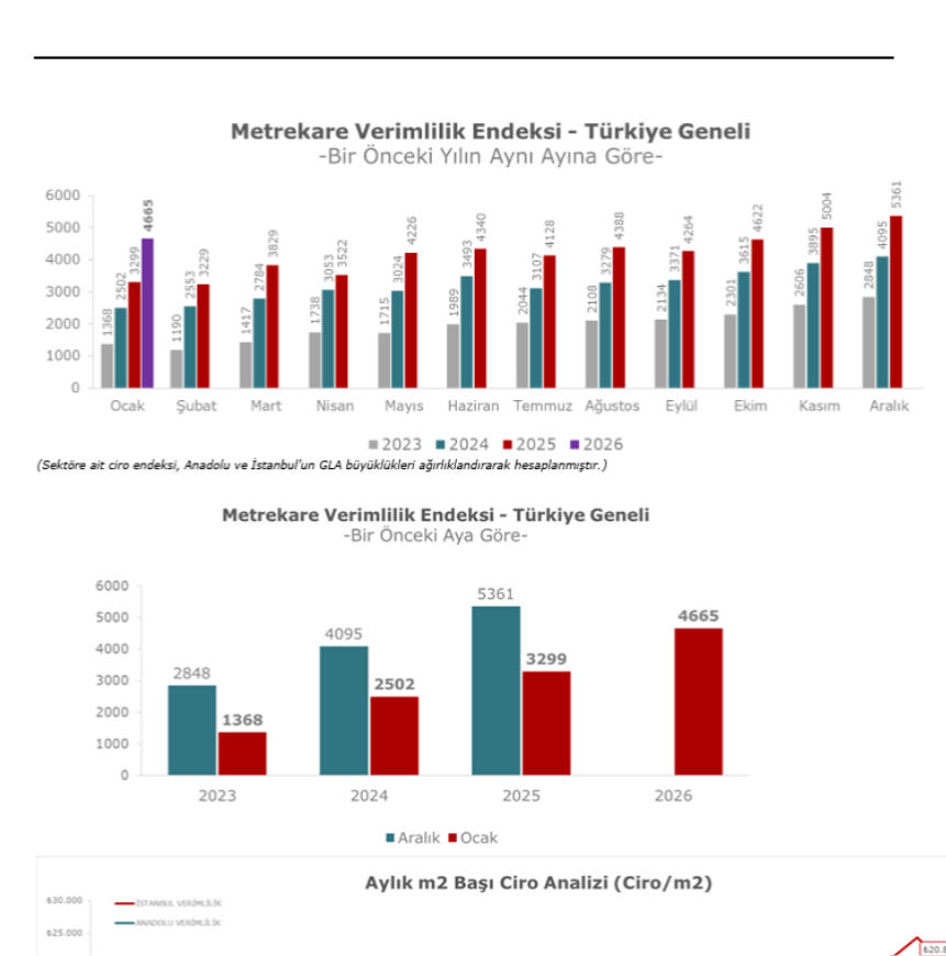 Ocak 2026’da yıllık enflasyon oranının yüzde 30,65 seviyesinde gerçekleştiği dikkate alındığında, metrekare başına ciro artışının enflasyonun üzerinde gerçekleştiği görülüyor. Bu durum, alışveriş merkezlerindeki ticari hareketliliğin ve ciro performansının güçlü seyrini koruduğuna işaret ediyor.