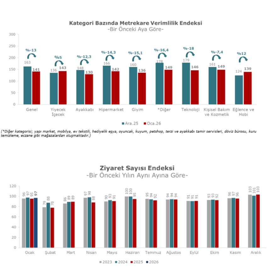 Ocak ayında alışveriş merkezlerine yönelik ziyaretçi sayısı geçen yılın aynı dönemine göre yüzde 2 artış gösterdi. Ancak Aralık 2025’e kıyasla ziyaretçi endeksi yüzde 6 gerileyerek aylık bazdaki yavaşlamaya paralel bir tablo çizdi.