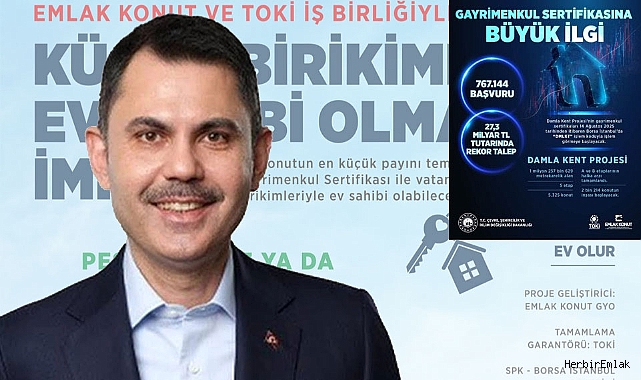 Çevre, Şehircilik ve İklim Değişikliği Bakanı Murat Kurum, Toplu Konut İdaresi Başkanlığı (TOKİ) ve Emlak Konut GYO güvencesiyle gayrimenkul sertifikası yöntemiyle halka arzı tamamlanan Damla Kent Projesi’ne beklenenden çok daha yüksek talep geldiğini duyurdu.