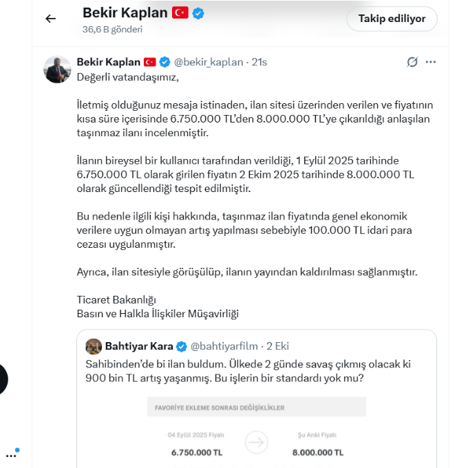 Bakanlık Basın Danışmanı Bekir Kaplan, sosyal medya platformu X üzerinden yaptığı açıklamada, vatandaşın şikâyeti üzerine inceleme başlatıldığını, fiyat artışının kısa sürede 1 milyon 250 bin TL seviyesine ulaştığının tespit edildiğini açıkladı.