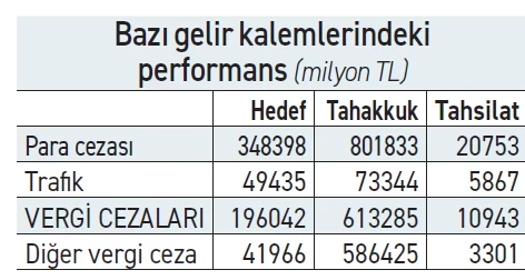 Vergi cezaları içinde en yüksek tahakkuk, “diğer para cezaları” kaleminde gerçekleşti. Bu kalemde yılın tamamında 41 milyar 966 milyon lira gelir beklenirken, Ocak ayında tahakkuk 586 milyar 425 milyon liraya çıktı.