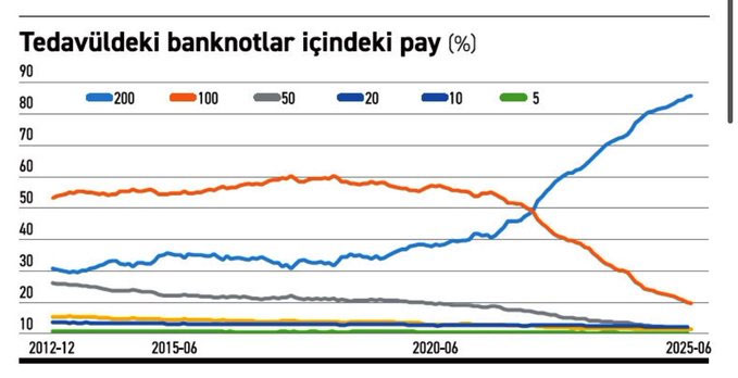 Türkiye’nin en büyük kupürlü banknotu olan 200 TL, son 10 yılda tedavüldeki payını yüzde 28,2’den yüzde 85,3’e yükseltti. 200’lük banknotun bu hızlı yükselişi, hem enflasyonun hem de paranın alım gücündeki düşüşün somut bir göstergesi olarak değerlendiriliyor.