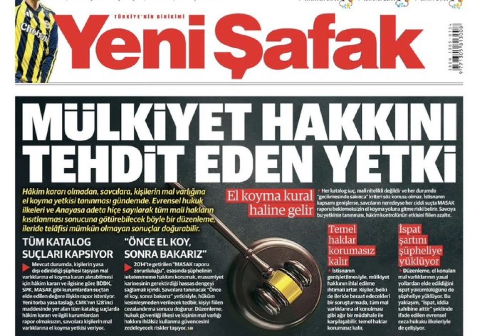 Bu arada iktidara yakınlığıyla bilinen Yeni Şafak gazetesi, MASAK'a verilen yetkiyi. "Mülkiyet hakkını tehdit eden yetki" diye eleştirel bir yaklaşımla manşetine taşıdı. Gazete, getirilmek istenen düzenlemeyi, "Evrensel hukuk ilkeleri ve Anayasa adeta hiçe sayılarak tüm mali hakların kısıtlanması sonucuna götürebilecek böyle bir düzenleme, ileride telâfisi mümkün olmayan sonuçlar doğurabilir." diye nitelendirdi.