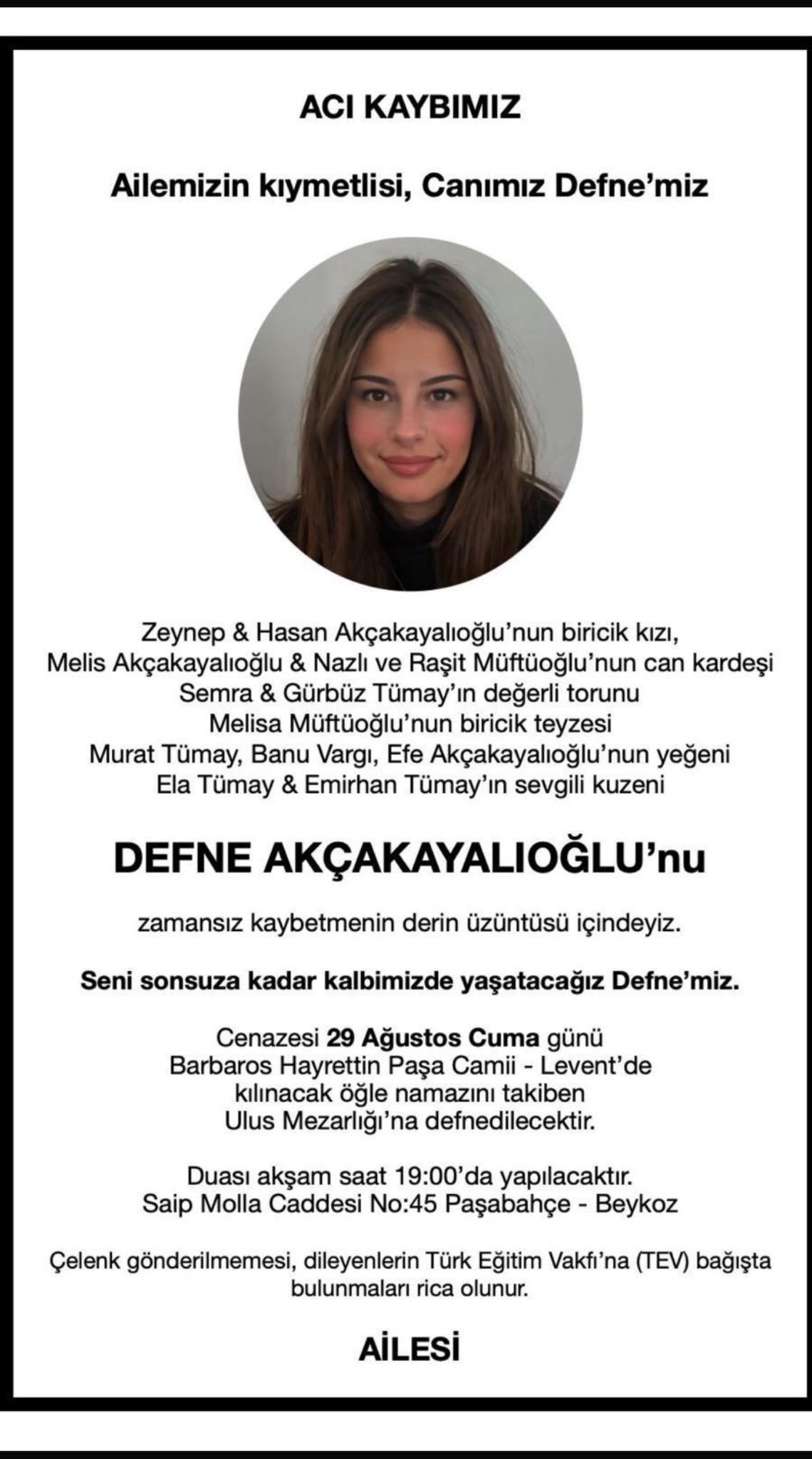 Defne Akçakayalıoğlu için 29 Ağustos Cuma günü Barbaros Hayrettin Paşa Camii’nde öğle namazına müteakip cenaze namazı kılınacak. Akçakayalıoğlu’nun cenazesi daha sonra Ulus Mezarlığı’na defnedilecek.