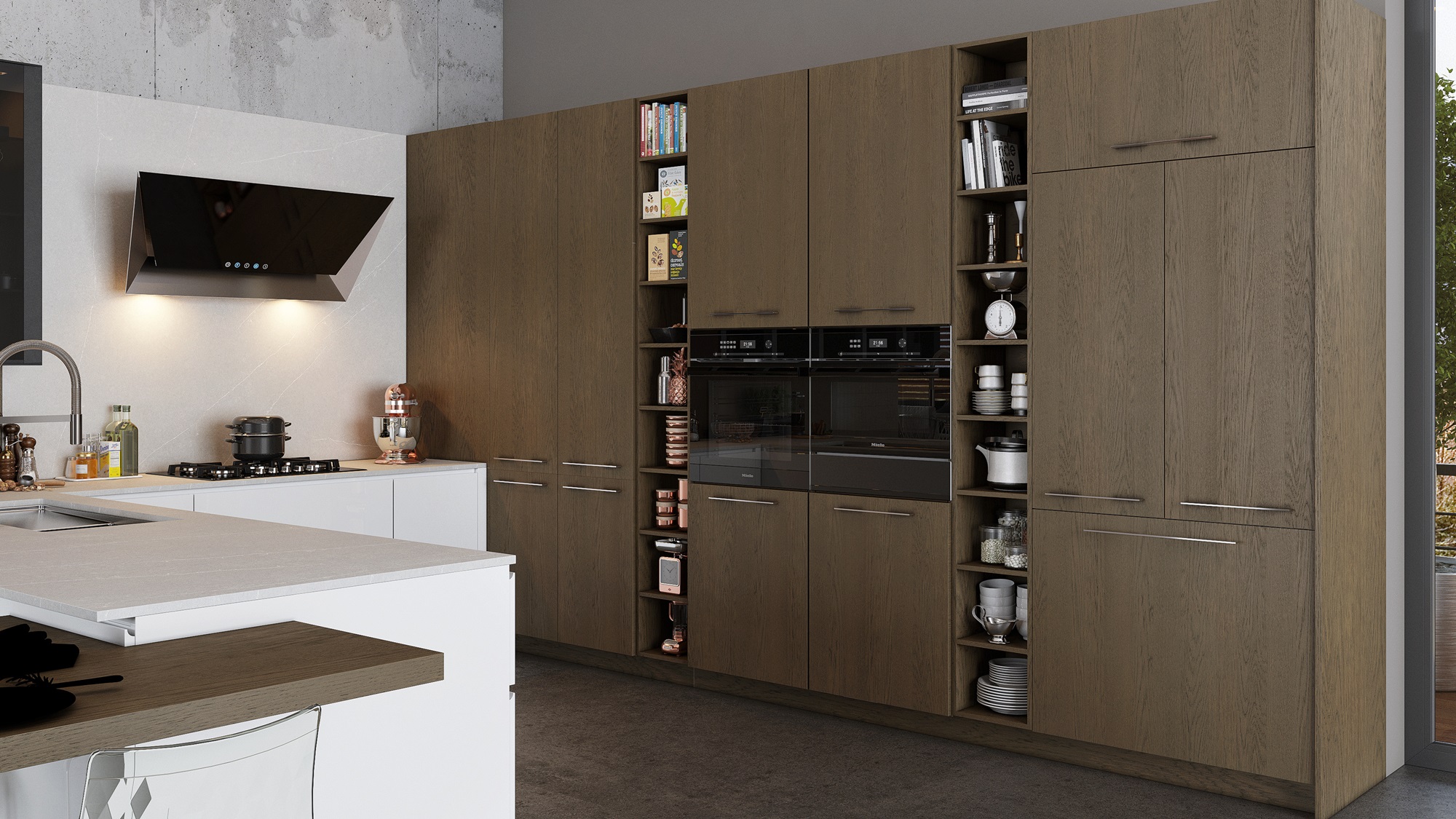 Küçük mutfaklarda depolama kapasitesini artırmak en önemli tasarım adımlarından biri olarak öne çıkıyor. Tavan kotuna kadar yükselen dolap modülleri, tam açılım ray sistemine sahip çekmeceler ve kör köşe mekanizmaları, kullanılabilir hacmi maksimuma çıkarıyor.