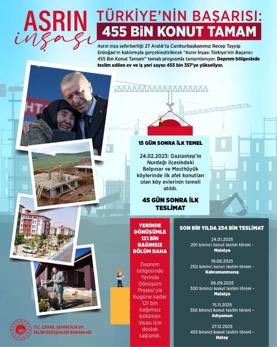 6 Şubat 2023’te Kahramanmaraş merkezli depremlerin ardından başlatılan ve “asrın felaketi” sonrası Türkiye’nin en büyük yeniden inşa hamlesi olarak nitelendirilen çalışmalar, 455 bin 357 bağımsız bölümün tamamlanmasıyla yeni bir aşamaya ulaştı. Cumhurbaşkanı Recep Tayyip Erdoğan’ın Hatay’da katıldığı “455 Bininci Afet Konutu Kura Çekimi ve Anahtar Teslim Töreni” ile hak sahiplerine anahtarlar teslim edildi.