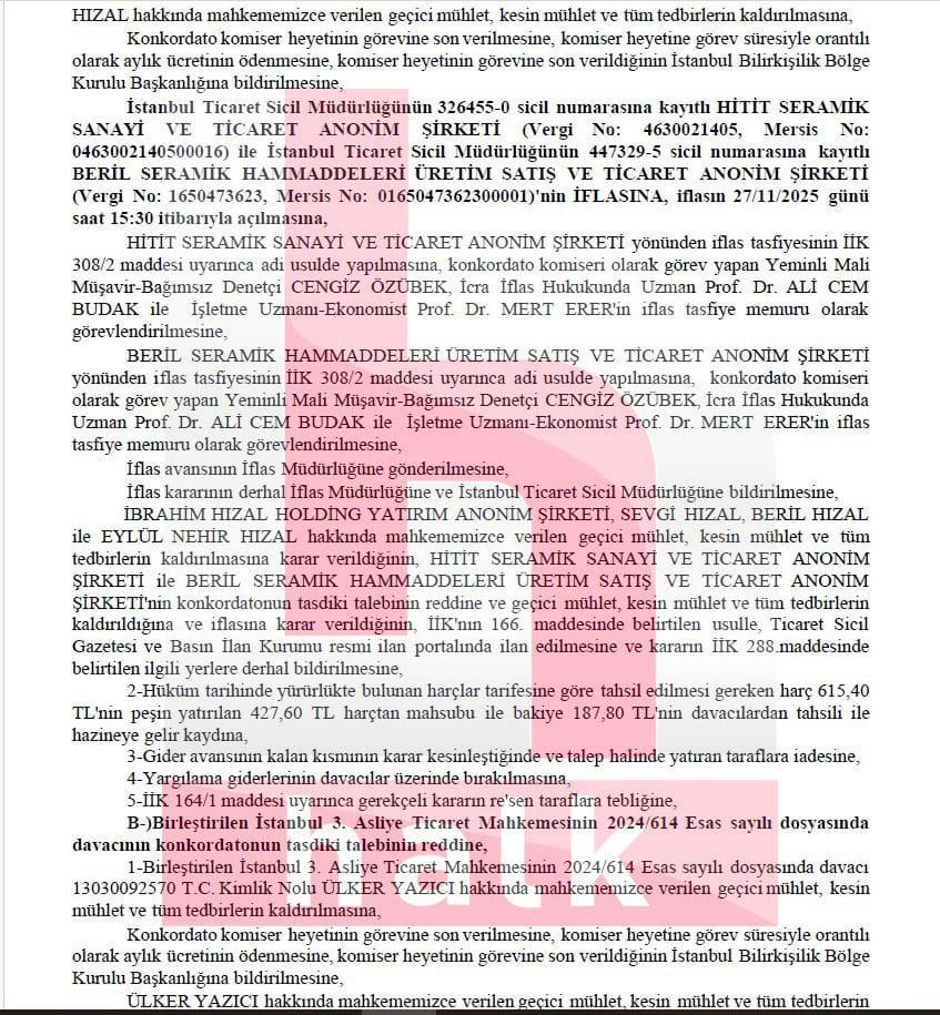 Aynı davada, İbrahim Hızal Holding AŞ için daha önce verilen geçici mühlet kararı da kaldırıldı. Bu kararla birlikte holding, hacizlere karşı korumasız hale geldi.