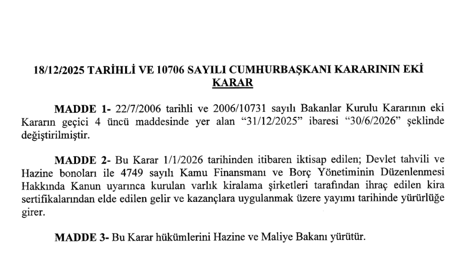 Düzenleme kapsamında, 2026 yılının 1 Ocak – 30 Haziran döneminde iktisap edilen devlet tahvili, hazine bonosu ve kira sertifikalarından elde edilecek gelirler için de tevkifat oranı yüzde sıfır olarak uygulanmaya devam edilecek.