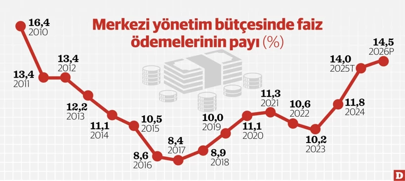 2006’da bütçenin üçte birini oluşturan faiz harcamaları sonraki yıllarda düşüş eğilimine girmiş, 2017’de yüzde 8,4’e kadar gerilemişti. Ancak 2019’dan itibaren yeniden yükselen faiz yükü, 2026 projeksiyonlarında tarihi seviyelere ulaşıyor.