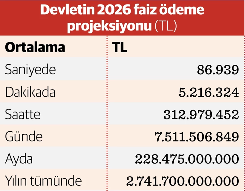Bu yılın sonunda 2 trilyon 52,7 milyar TL seviyesinde gerçekleşmesi beklenen faiz ödemeleri, 2026’da yeni bir rekor kıracak. Hesaplamalara göre devletin faiz ödemesi aylık ortalama 228 milyar TL, günlük 7 milyar 511 milyon TL, saatte 312 milyon TL, dakikada 5 milyon TL ve saniyede yaklaşık 87 bin TL olacak.