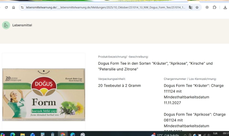 Almanya Federal Gıda ve Tarım Bakanlığı’na bağlı Federal Tüketici Koruma ve gıda güvenliği Dairesi (BVL), Türkiye menşeli Doğuş Form çayları hakkında toplatma kararı aldı. Almanya’da satılan bazı çeşitlerde kanserojen madde tespit edilmesi üzerine ürünlerin piyasadan çekilmesi istendi.