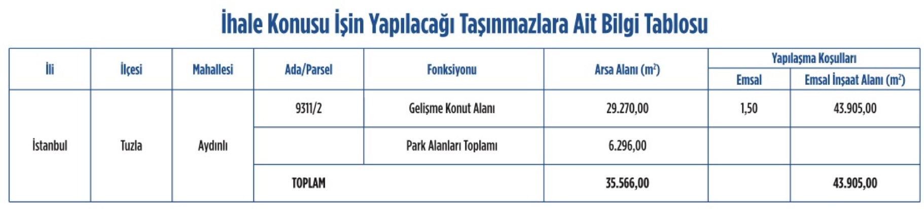 10 YÜKSEKDAĞ GAYR. YAT. A.Ş. & TONA YAPI ENERJİ SAN. VE TİC. A.Ş. İŞ ORTAKLIĞI- 35 BİN 566 METREKARE ALANA SAHİPEmlak Konut Gayrimenkul Yatırım Ortaklığı’nın Tuzla Aydınlı arsası 35 bin 566 metrekare alana sahip. Söz konusu arsa gelişme konut alanı ve park alanı fonksiyonlu şeklinde belirtildi.