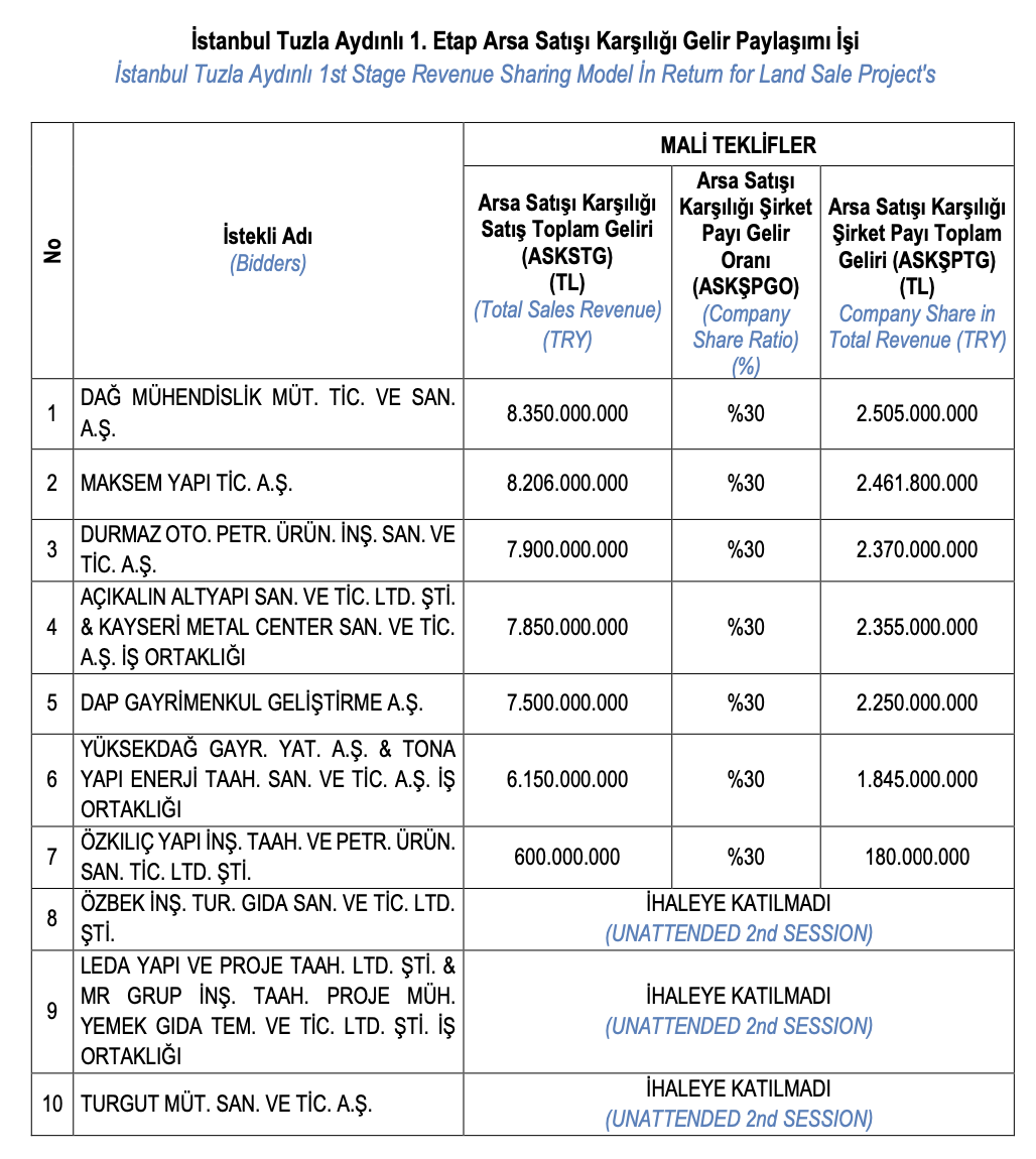 Emlak Konut GYO İstanbul Tuzla Aydınlı 1. Etap Arsa Satışı Karşılığı Gelir Paylaşımı İşi ihalesinin 2. oturumu için gelen teklifler şu şekilde: