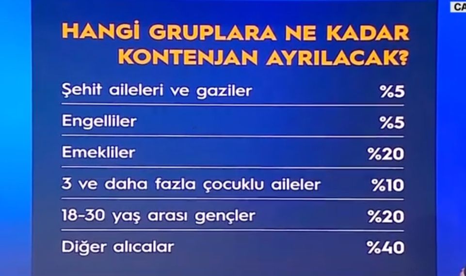 Projede şehit yakınları, gaziler ve engelliler için yüzde 5, üç ve daha fazla çocuğu olan aileler için yüzde 10, emekliler için yüzde 20 kontenjan ayrıldığını açıklayan Erdoğan, ayrıca 18-30 yaş arası gençlere de yüzde 20’lik özel bir pay verileceğini söyledi.
