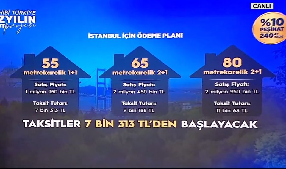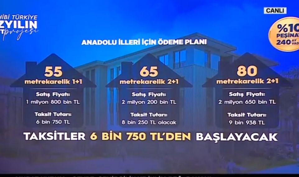 500 bin konutluk proje kapsamında evlerin satış bedelleri 1 milyon 800 bin TL’den, taksitleri ise ayda 6 bin 750 TL’den başlayacak.