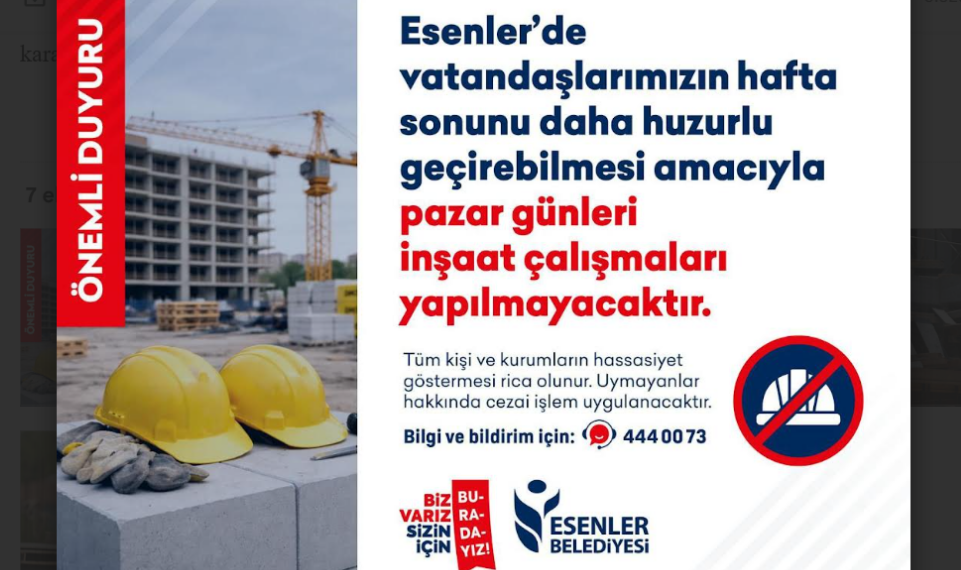 İstanbul’un Esenler ilçesinde, vatandaşların hafta sonunu daha huzurlu geçirebilmesi için önemli bir karar alındı. Esenler Belediyesi tarafından hayata geçirilen yeni uygulamaya göre, ilçe genelinde pazar günleri inşaat faaliyetlerine izin verilmeyecek.
