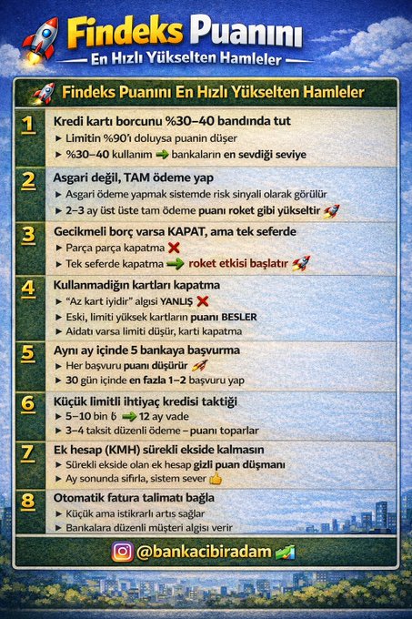 Findeks kredi notu, Türkiye’de kredi kullanırken en kritik kriterlerden biri olmaya devam ediyor. Bankalar, düşük riskli müşterileri ödüllendirirken yüksek puanlı profillere daha kolay kredi veriyor. Peki puanı yükseltmek için en etkili ve en hızlı çalışan hamleler neler?İşte bankacibiradam hesabından yapılan 2025-2026 döneminde kredi notunu roket gibi fırlatacak en pratik 8 taktik:1. Kredi Kartı Borcunu %30-40 Bandında TutunLimitinizin %90 ve üzeri dolması puanınızı ciddi şekilde düşürür.