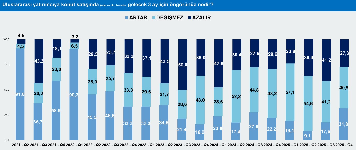 Araştırma kapsamında ankete katılan GİGDER üyelerinin %40,9’u, önümüzdeki üç ayda uluslararası yatırımcıya yönelik konut satışlarında önemli bir değişim beklemediklerini ifade etti.