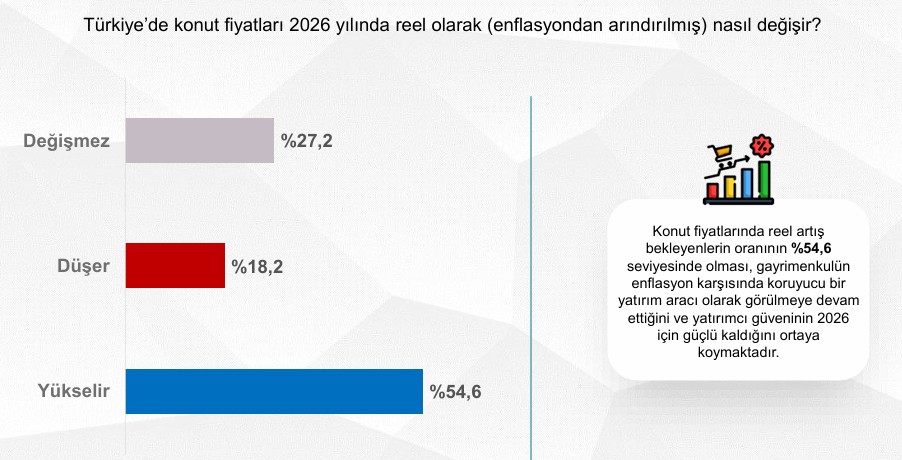 Fiyatlarda düşüş öngörenlerin oranının %18,2 ile sınırlı kalması, gayrimenkulün enflasyona karşı değer koruma aracı olarak görülmeye devam ettiğini ortaya koydu.
