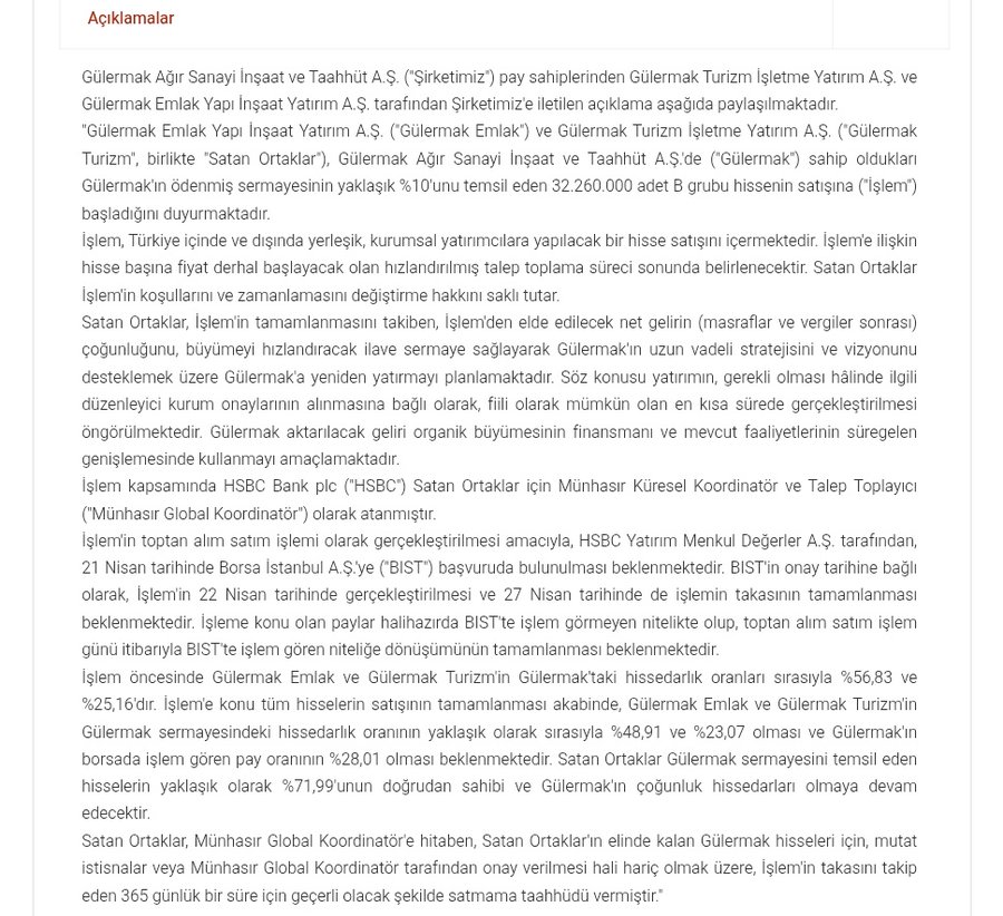 Yapılan açıklamaya göre, iki ortak toplamda 44.841.400 adet B grubu payı elden çıkardı. Bu satış, Gülermak’ın ödenmiş sermayesinin yaklaşık %13,9’una karşılık geliyor.