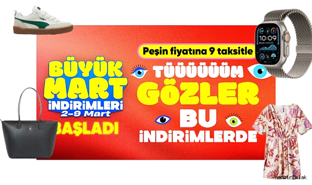 “Büyük Mart İndirimleri” kampanyası 9 Mart tarihine kadar devam edecek. Geniş kategori yelpazesi, yüksek indirim oranları ve 9 taksit imkanıyla kampanya, bahar alışverişi yapmak isteyen kullanıcılar için önemli bir fırsat dönemi olarak öne çıkıyor.