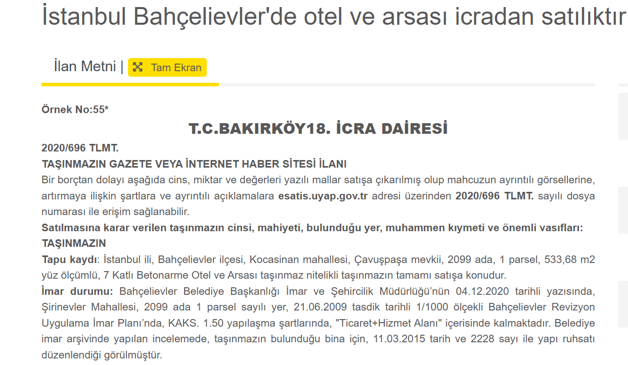 İcra ilanında yer alan bilgilere göre taşınmaz, İstanbul ili Bahçelievler ilçesi Kocasinan Mahallesi, Çavuşpaşa mevkiinde bulunuyor. 2099 ada 1 parsel üzerinde yer alan ve 533,68 metrekare arsa alanına sahip taşınmaz, tapuda “7 katlı betonarme otel ve arsası” niteliğiyle kayıtlı.