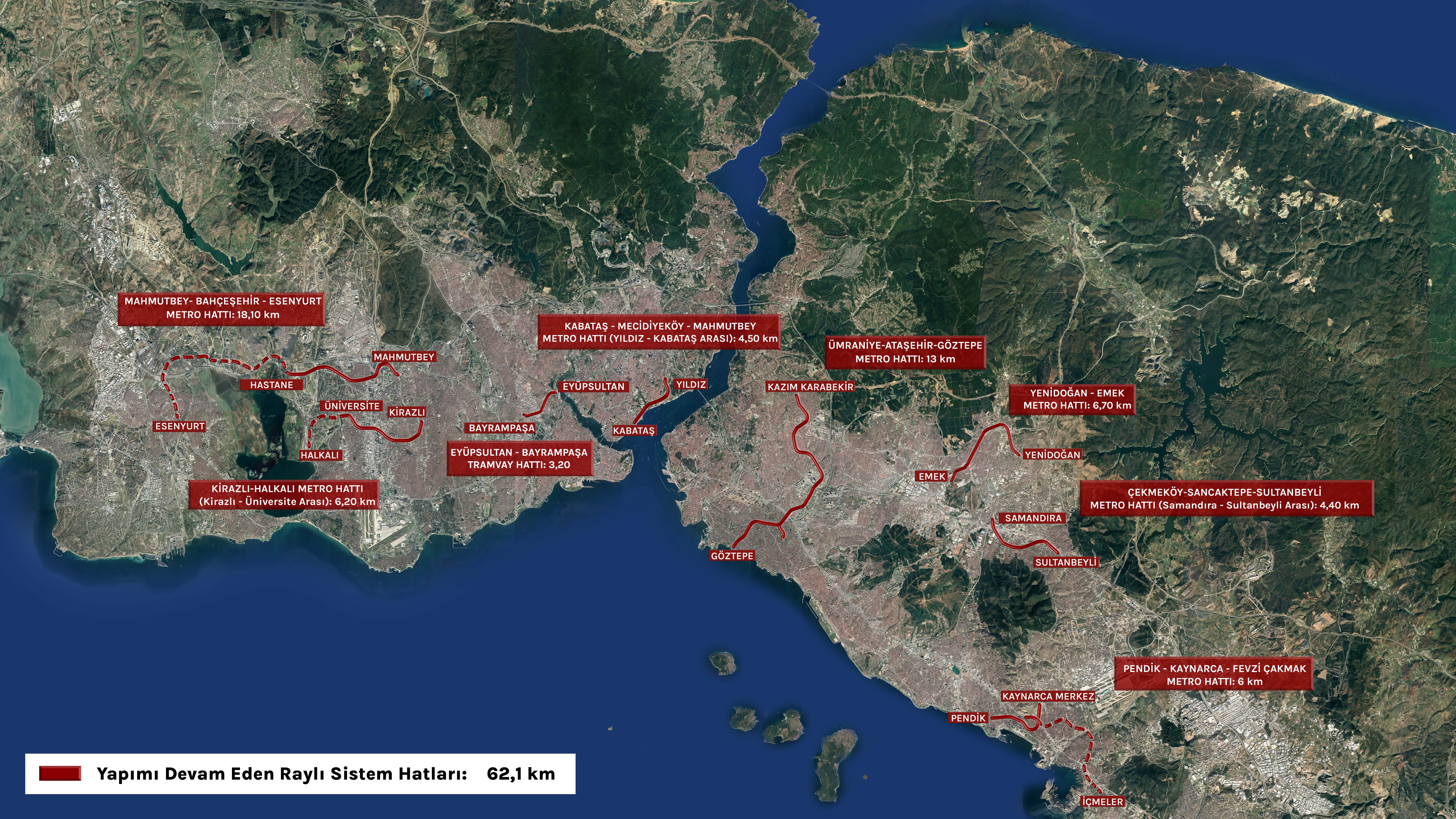 İBB, 2019’dan bu yana yaklaşık 2,5 milyar Euro kaynak sağlayarak 65,1 km’lik raylı sistemi hizmete aldı. Ulaştırma ve Altyapı Bakanlığı tarafından yapımı tamamlanıp işletmesi İBB’ye devredilen hatlarla birlikte bu uzunluk 87,1 km’ye ulaştı.