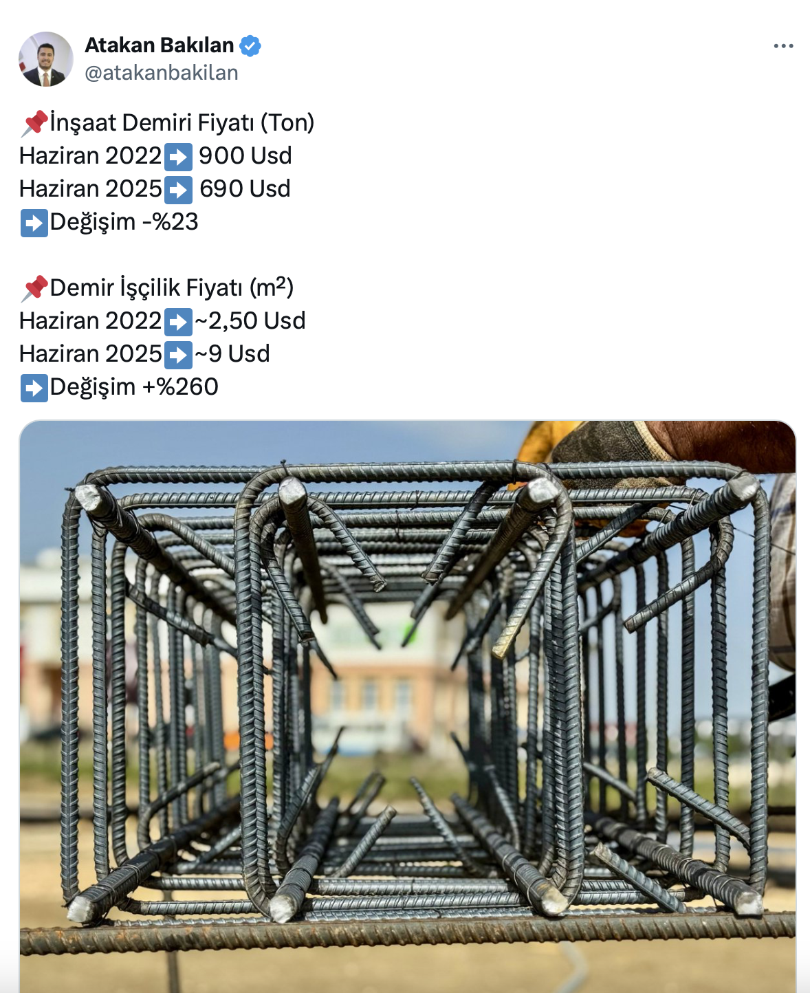 İnşaat sektörü son yıllarda maliyet artışlarıyla sık sık gündeme gelirken, bu kez dikkat çeken bir fiyat çarpıklığı inşaat mühendisi Atakan Bakılan tarafından ortaya kondu. Resmi sosyal medya hesabı üzerinden paylaşım yapan Bakılan, inşaat demiri fiyatlarının son üç yılda yüzde 23 düştüğünü, ancak aynı dönemde demir işçiliği fiyatlarının yüzde 260 oranında arttığını duyurdu.