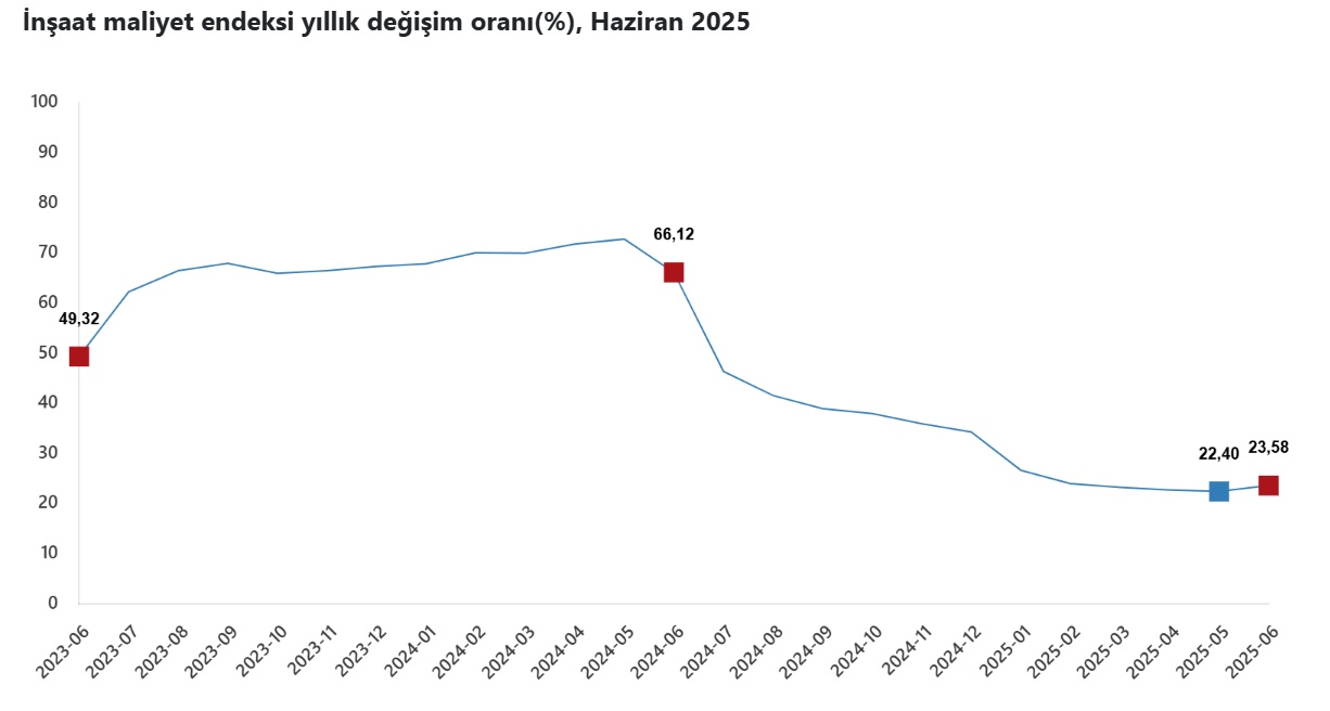 Türkiye İstatistik Kurumu (TÜİK) verilerine göre inşaat maliyet endeksi temmuz ayında bir önceki aya göre %1.37, geçen yılın aynı ayına göre ise %23.58 arttı.