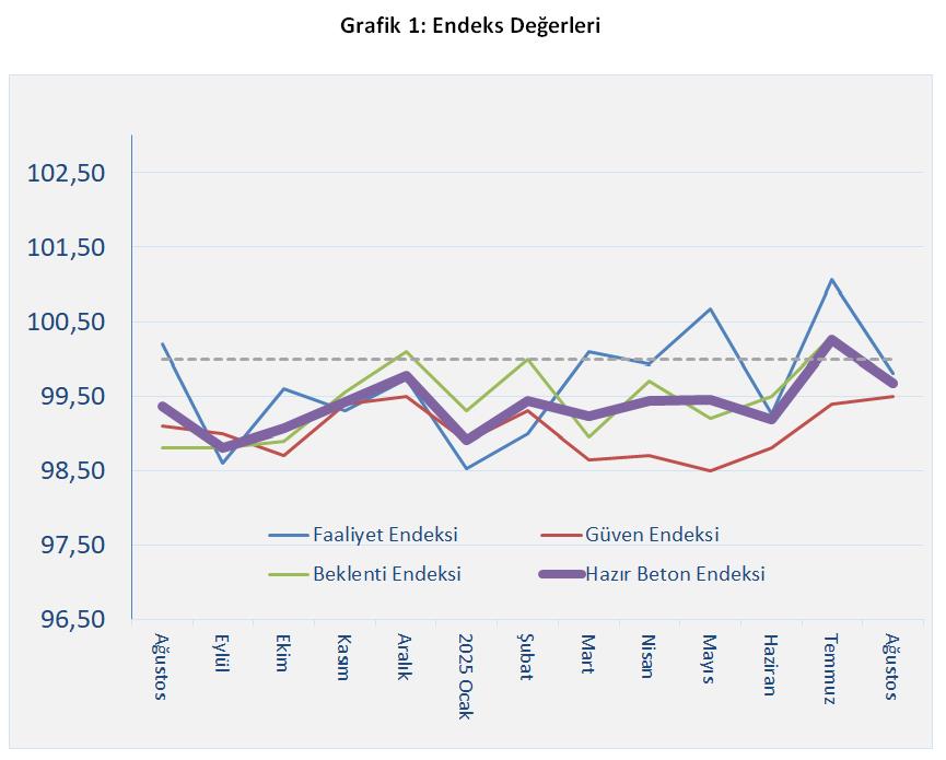 Rapora göre, Beklenti Endeksi temmuzdaki pozitif görünümünü kaybederek negatif tarafa geçti. Güven Endeksi ise temmuz seviyesine yakın bir değer almasına rağmen eşik değerin altında kaldı. Birleşik Hazır Beton Endeksi de benzer şekilde düşüş kaydederek temmuzda çıktığı eşik seviyesinin yeniden altına geriledi.