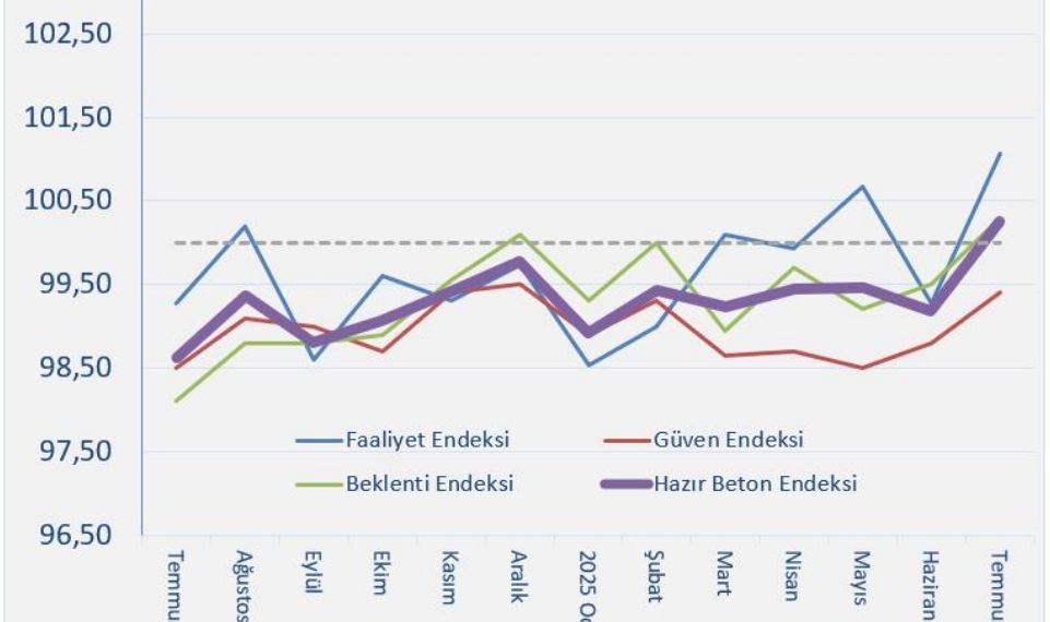 Hazır Beton Endeksi sonuçlarına göre Faaliyet Endeksi, hem geçen yılın aynı ayına göre yükseldi hem de temmuzda endeks değeri bakımından zirvede yer aldı. beklenti endeksi de artış göstererek eşik değer seviyesine yaklaştı. Güven Endeksi’nde ise yukarı yönlü bir ivme olmasına rağmen hâlâ eşik değerin altında bulunuyor. Buna karşılık Birleşik Beton Endeksi, son bir yıldır ilk kez eşik değerin üzerine çıktı.