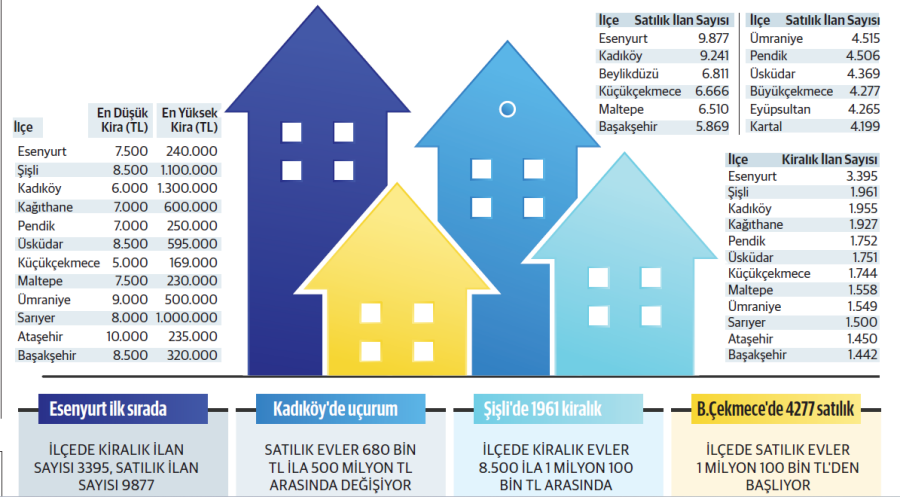 Kiralık piyasasında da Esenyurt öne çıkıyor. İlçede 3.395 kiralık ilanı bulunurken, kiralar 7.500 TL’den 240 bin TL’ye kadar uzanıyor. Kadıköy ve Şişli’de ise hem kira fiyatları hem de ilan sayıları dikkat çekici seviyelerde.