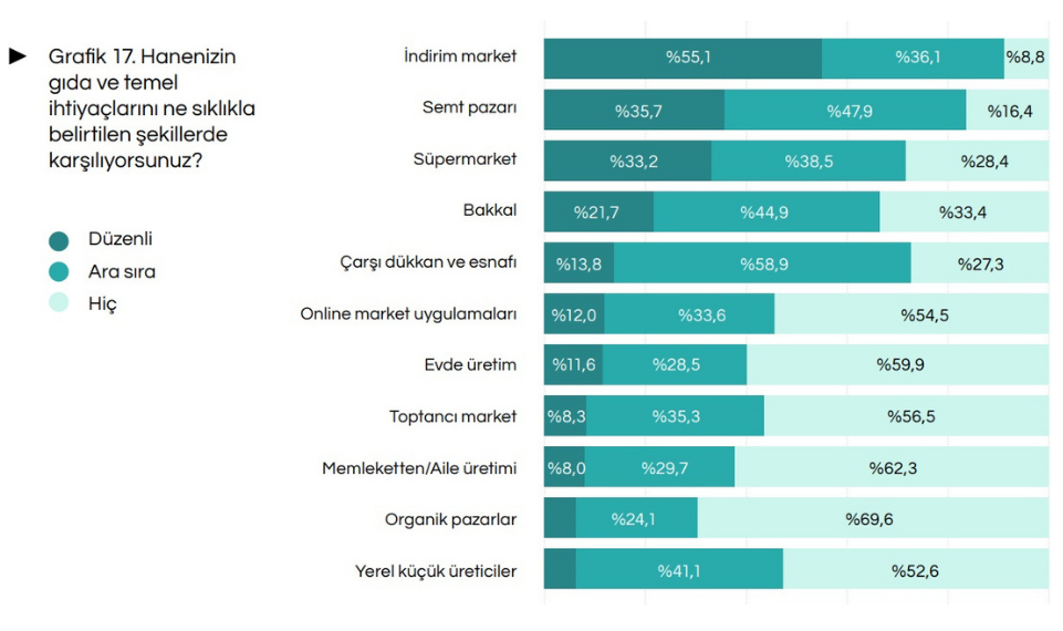 Raporda dikkat çeken bir diğer başlık ise gıda ve temel ihtiyaç alışverişlerinde indirim marketlerinin artan ağırlığı oldu.