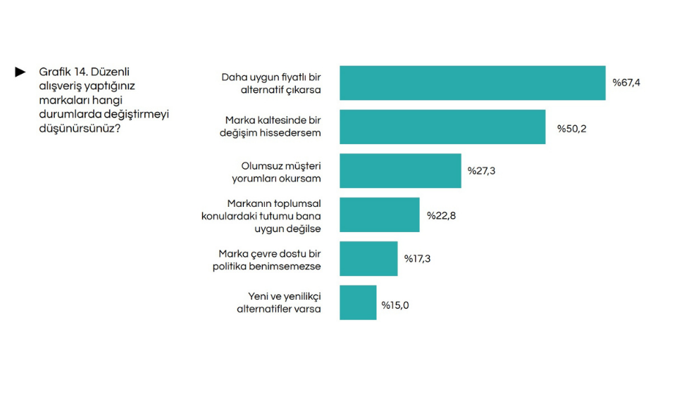 Araştırma sonuçlarına göre İstanbul’da marka sadakati daha kırılgan bir yapıya dönüştü. Katılımcıların yüzde 67,4’ü, düzenli alışveriş yaptığı markayı daha uygun fiyatlı bir alternatif çıkması halinde değiştirmeyi düşüneceğini söyledi.