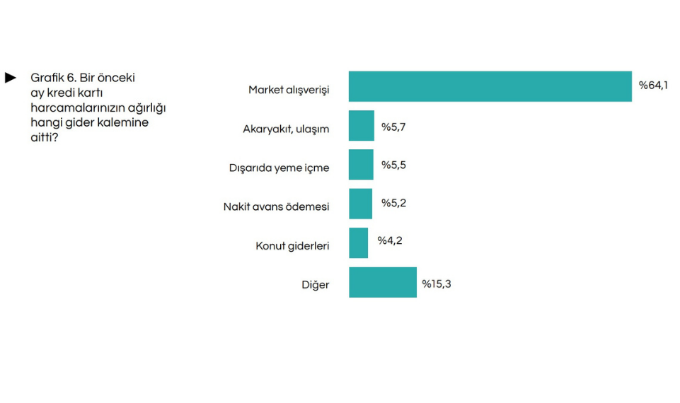 Araştırmada kredi kartı harcamalarında market alışverişi açık ara en yüksek paya sahip oldu. Katılımcıların yüzde 64,1’i kredi kartı harcamalarında market alışverişinin en büyük paya sahip olduğunu söyledi.