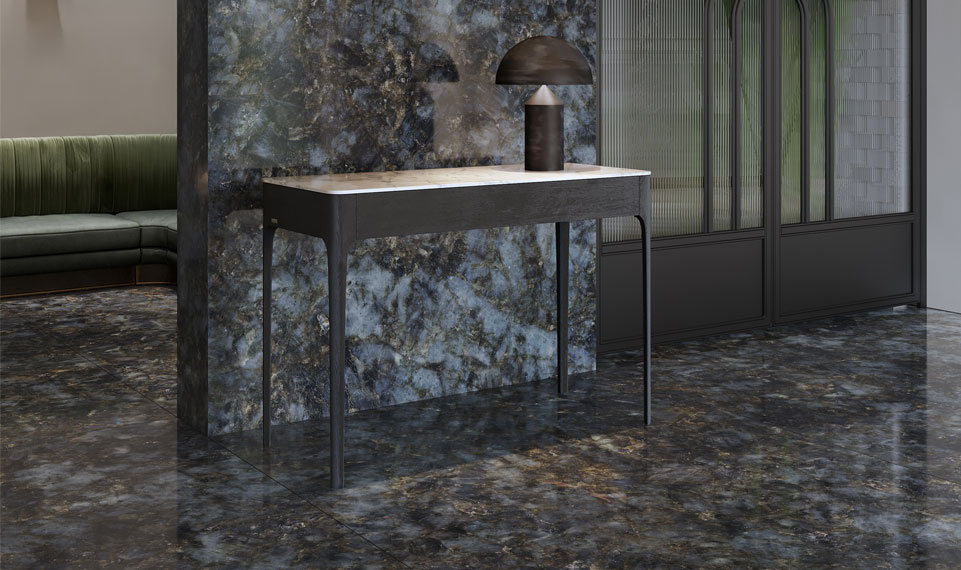 Yarı değerli bir taş olan Labradorite’ın doğallığından esinlenen bu yüzey, siyah zemin üzerinde mavi ve altın tonlarında ışıltılı parçacıklarla etkileyici bir kontrast sunuyor. Lüks mekanlar için ideal bir seçenek olarak öne çıkan Labradorite, yalnızca estetik değil aynı zamanda güçlü bir tasarım dili sunuyor.