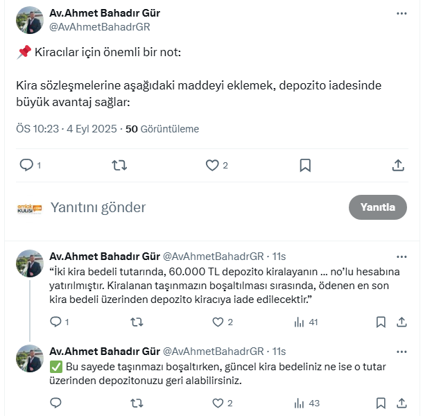 Avukat Ahmet Bahadır Gür, bu noktada kiracıların haklarını koruması için kira sözleşmelerine mutlaka eklenmesi gereken bir maddeyi paylaştı. Gür, sosyal medya hesabından yaptığı açıklamada şu ifadeleri kullandı: