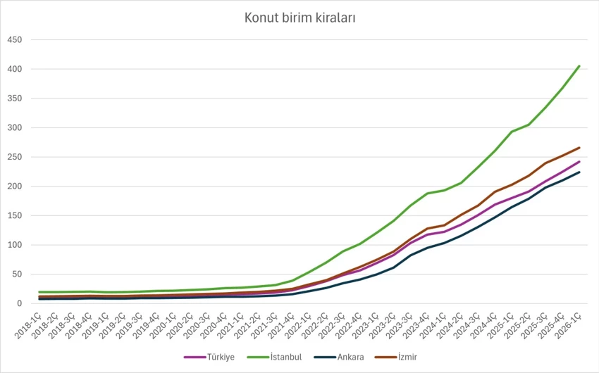 2026 yılı ilk çeyrek verilerine göre ortalama kira seviyeleri büyükşehirlerde önemli ölçüde yükseldi: