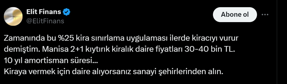 Finans piyasaları, teknik ve temel analiz stratejisti Elit Finans, X sosyal medya hesabından yaptığı paylaşımda, yüzde 25 kira sınırlamasının ileride kiracıları olumsuz etkileyeceğini belirtti. Paylaşımında, “Manisa’da 2+1 kıytırık daire fiyatları 30-40 bin TL. 10 yıl amortisman süresi… Kiraya vermek için daire alıyorsanız sanayi şehirlerinden alın.” ifadelerini kullandı.Paylaşım ve Gelen Yorumlar