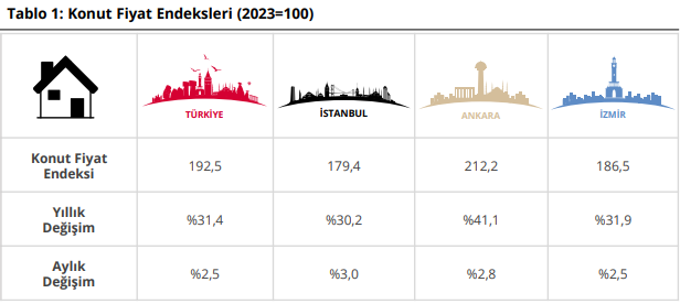İzmir’de ise konut fiyatları aylık yüzde 2,5 artışla birlikte yıllık yüzde 31,9 oranında yükseldi.