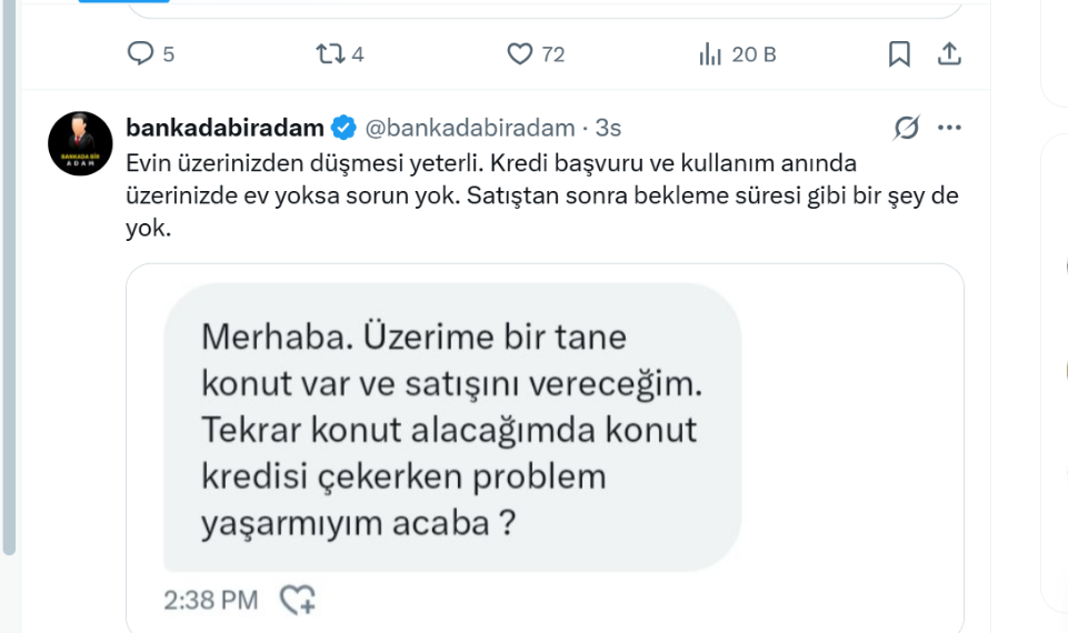 Sosyal medyada finans konularıyla ilgili paylaşımlarıyla bilinen ve 89 bin takipçisi bulunan Bankadabiradam isimli hesap, konuyla ilgili yöneltilen soruya dikkat çeken bir cevap verdi. Hesap, “Evin üzerinizden düşmesi yeterli. Kredi başvuru ve kullanım anında üzerinizde ev yoksa sorun yok. Satıştan sonra bekleme süresi gibi bir şey de yok” ifadelerini kullandı.