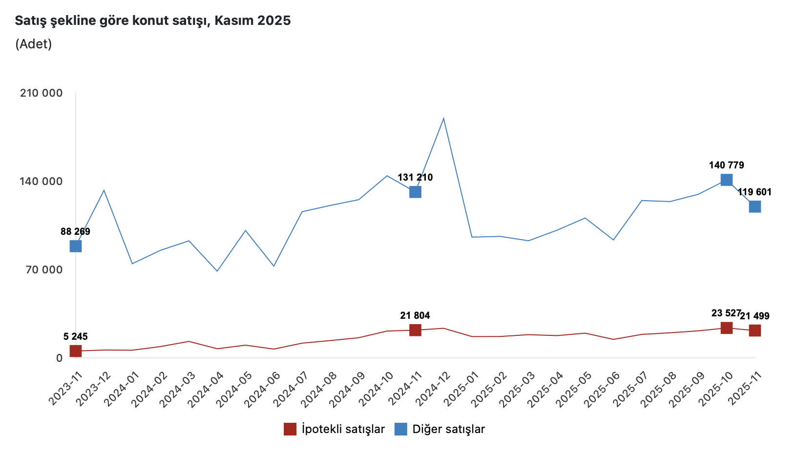 İpotekli olmayan satışları kapsayan diğer konut satışları, Kasım ayında yıllık bazda yüzde 8,8 azalarak 119 bin 601 oldu.