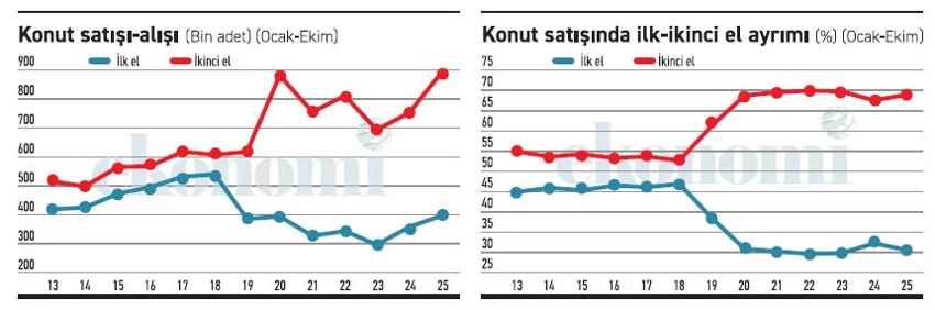 Bu rakamlar, ilk el konut satışında son yıllarda yaklaşık yüzde 25’lik bir daralmaya işaret ediyor.
