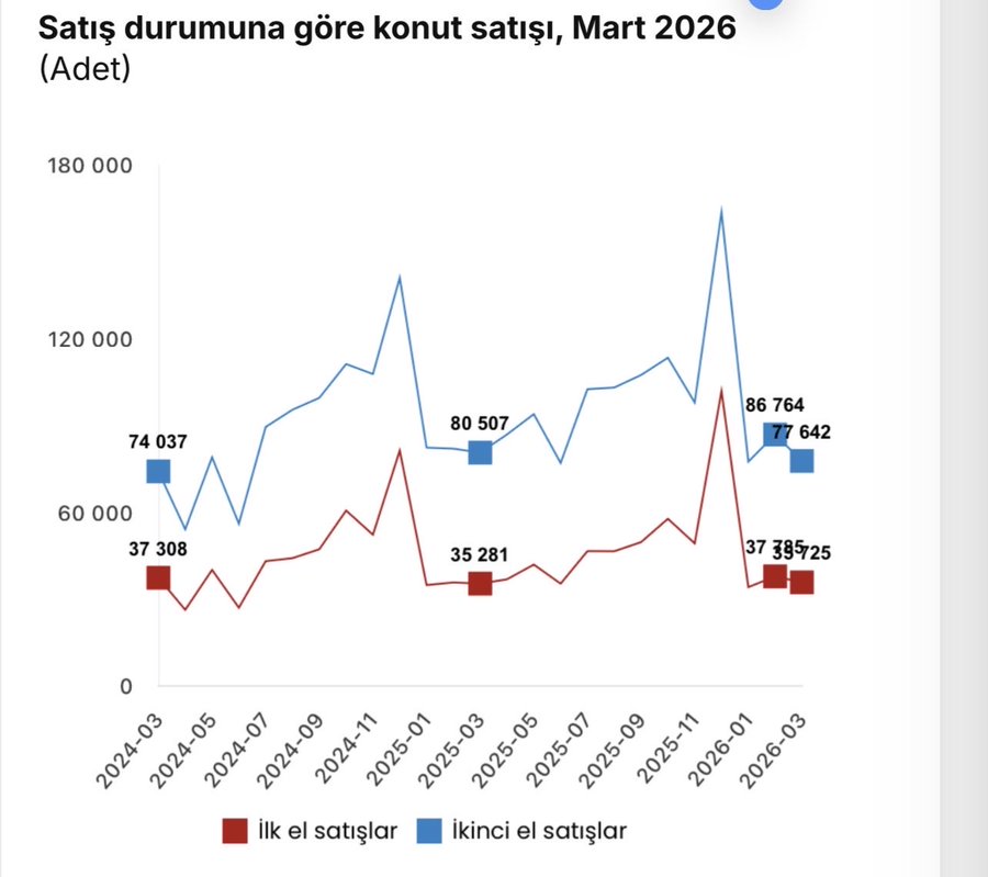 Mart 2026’da ilk el konut satışları 35 bin 725 adet olarak gerçekleşti. Bu rakam, geçen yılın aynı ayına göre yalnızca yüzde 1,3’lük bir artış anlamına geliyor. Söz konusu artış, sektör temsilcileri tarafından “yetersiz” olarak değerlendiriliyor.