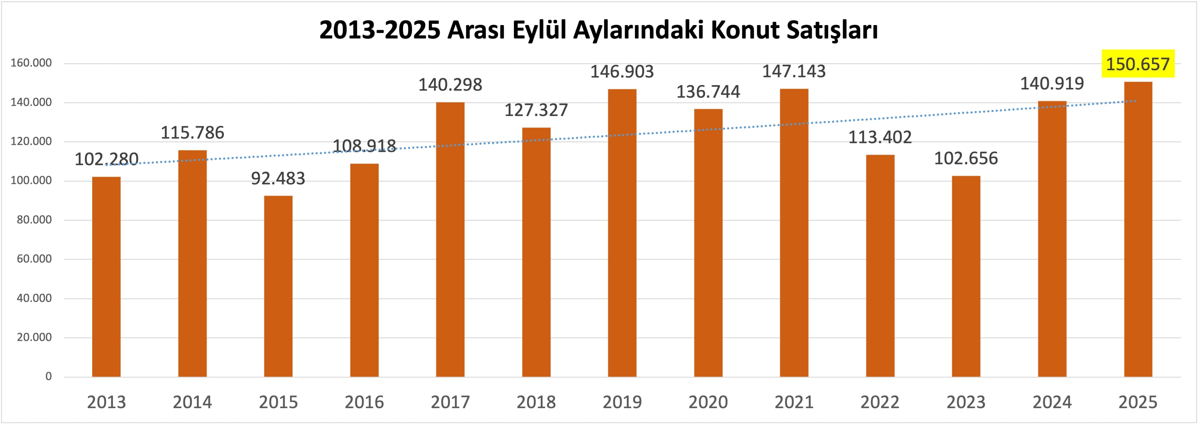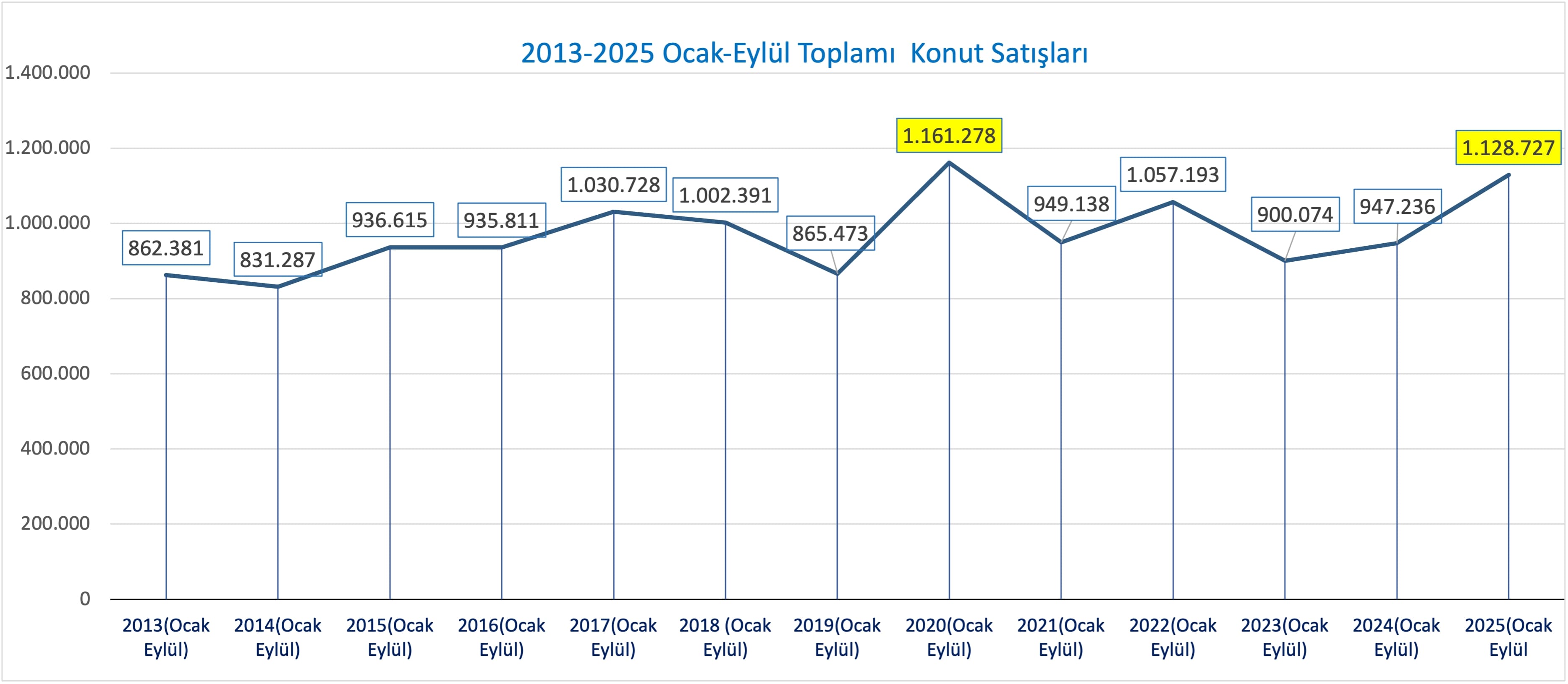 Türkiye genelinde konut satışları eylülde yüzde 6,9 artarak 150 bin 657 adetle tüm zamanların en yüksek eylül ayı satışına ulaştı. Ocak–eylül döneminde ise satışlar yüzde 19,2 artışla 1 milyon 128 bin 727 olarak gerçekleşti.