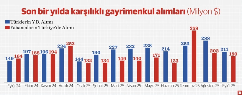 Eylül ayında yabancılar Türkiye’den 180 milyon dolarlık gayrimenkul alırken, Türklerin yurt dışı alımları 211 milyon dolara çıktı. Ocak-eylül döneminde yabancıların alımları 1,6 milyar dolar, Türklerin alımları ise 1,997 milyar dolar oldu. Son bir yılda ise tablo daha da belirginleşti: 2,233 milyar dolar yabancı alımına karşılık Türklerin yurt dışı yatırımı 2,624 milyar dolar.