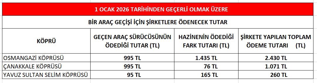 Karayolları Genel Müdürlüğü (KGM) tarafından işletilen ve Kamu Özel İşbirliği (KÖİ) modeliyle özel şirketlerce yönetilen köprü ve otoyollarda geçiş ücretleri yeniden düzenlendi. Yeni tarifeler, 1 Ocak 2026 Perşembe günü saat 00.00’dan itibaren yürürlüğe girecek.