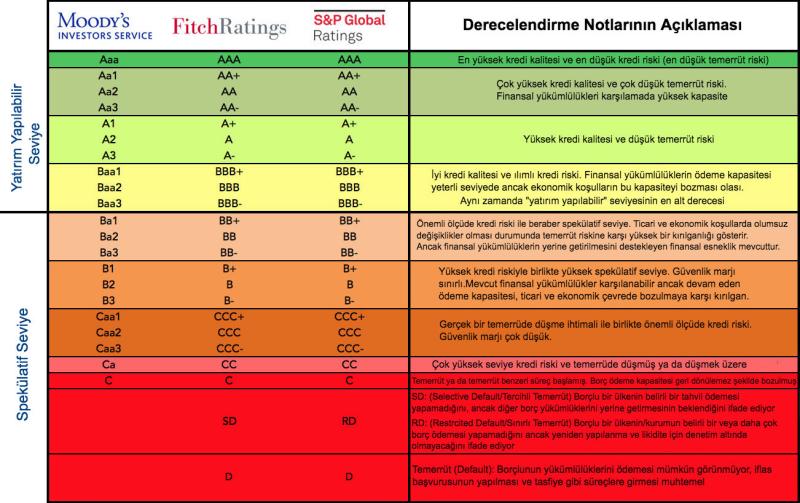 En yüksek not “AAA” seviyesidir ve borç geri ödeme kapasitesinin son derece güçlü olduğunu ifade eder. Notlar aşağı doğru indikçe risk artar. “BBB-” seviyesine kadar olan notlar “yatırım yapılabilir” kategoride yer alırken, bu seviyenin altı “spekülatif” yani yüksek riskli olarak kabul edilir.